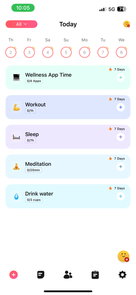 The last app I tried is called Habit which is a check-list style app. This app allows you to create your own habits that have to be completed each day. The habits I set for myself include 3 cups of water each day, 20 minutes of meditation, 7 hours of sleep, 1 hour of a workout/physical activity, and interacting with my other wellness apps daily. After using this app I enjoyed the satisfaction of checking things off as I go on about my day, but I do think that a plain old checklist or the notes app would suffice (see below for image.)
